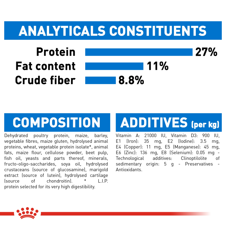 A high protein content* (27%) helps maintain muscle mass and a low-fat content helps limit weight gain. An optimal combination of soluble