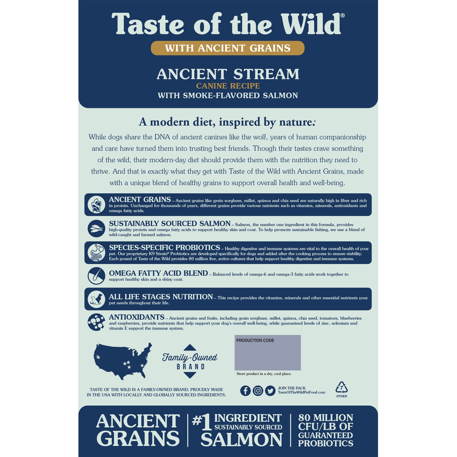 Taste of the Wild Ancient Stream Canine Recipe with Smoked Salmon is formulated to meet the nutritional levels established by the AAFCO Dog Food Nutrient Profiles for All Life Stages, including growth of large size dogs (70 lbs. or more as an adult).