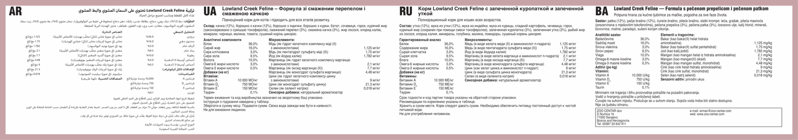 Duck, duck meal, turkey meal, chicken meal, sweet potatoes, lentils, peas, chicken fat (preserved with mixed tocopherols), roasted quail, roasted duck, natural flavor, salmon oil, DL-methionine, salt, potassium chloride, choline chloride, taurine, blueberries, raspberries, tomatoes, dried chicory root, dried Lactobacillus plantarum fermentation product, dried Bacillus subtilis fermentation product, dried Lactobacillus acidophilus fermentation product, dried Enterococcus faecium fermentation product, dried Bifidobacterium animalis fermentation product, zinc proteinate, vitamin E supplement, niacin, manganese proteinate, copper proteinate, zinc sulfate, manganese sulfate, copper sulfate, thiamine mononitrate (source of vitamin B1), vitamin A supplement, biotin, potassium iodide, calcium pantothenate, riboflavin (vitamin B2), pyridoxine hydrochloride (source of vitamin B6), vitamin B12 supplement, manganous oxide, sodium selenite, vitamin D supplement, folic acid.
